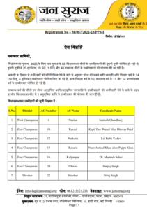 पार्टी ने कहा कि शेष सीटों पर उम्मीदवारों की घोषणा जल्द की जाएगी। बिहार विधानसभा की 243 सीटों के लिए चुनाव दो चरणों में 6 और 11 नवंबर को होंगे, जबकि मतगणना 14 नवंबर को होगी। जन सुराज पार्टी एनडीए और महागठबंधन को कड़ी चुनौती देने का दावा कर रही है, और सोशल मीडिया पर इस घोषणा को लेकर चर्चा तेज है।